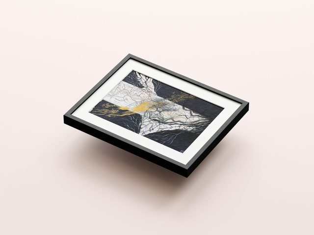 Technique : Ink, charcoal, gouache, acrylic paint, collage with Ledormeur map on black paper, size 40x60cm